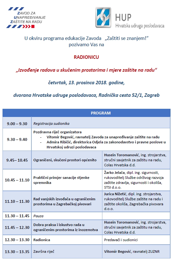 U okviru radionice predstaviti ćemo propise koji reguliraju sigurno izvođenje radova u navedenim uvjetima, praktične primjere iz Hrvatske te dobru praksu i iskustvo iz inozemstva, a u završnom dijelu radionice sudionici će imati priliku uz vodstvo mentora praktično demonstrirati postupanje i planiranje mjera sigurnosti prilikom izvođenja radova u skučenim i ograničenim prostorima.