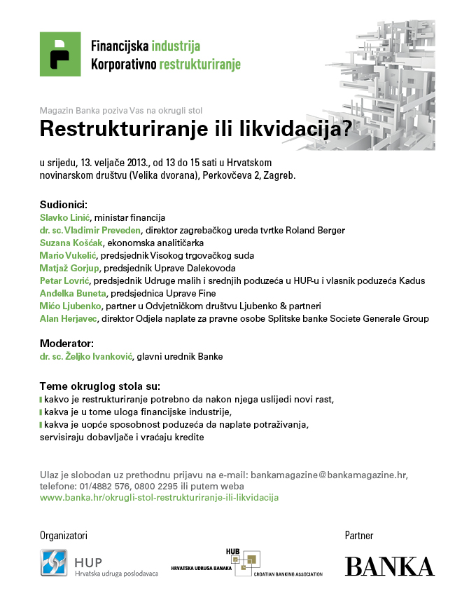 O šansama za preživljavanje i potencijalima za restrukturiranje poduzeća uz ministra Linića na okruglom stolu raspravljat će dr. sc. Vladimir Preveden, direktor zagrebačkog ureda tvrtke Roland Berger, Matjaž Gorjup, predjsednik uprave Dalekovoda, Petar Lovrić, predsjednik HUP-Udruge malih i srednjih poduzetnika, Mario Vukelić, predsjednik Visokog trgovačkog suda, analitičarka Suzana Košćak, Anđelka Buneta, predsjednica Uprave Fine, Mićo Ljubenko, partner u Odvjetničkom društvu Ljubenko & partneri i predstavnik Splitske banke. Poziv