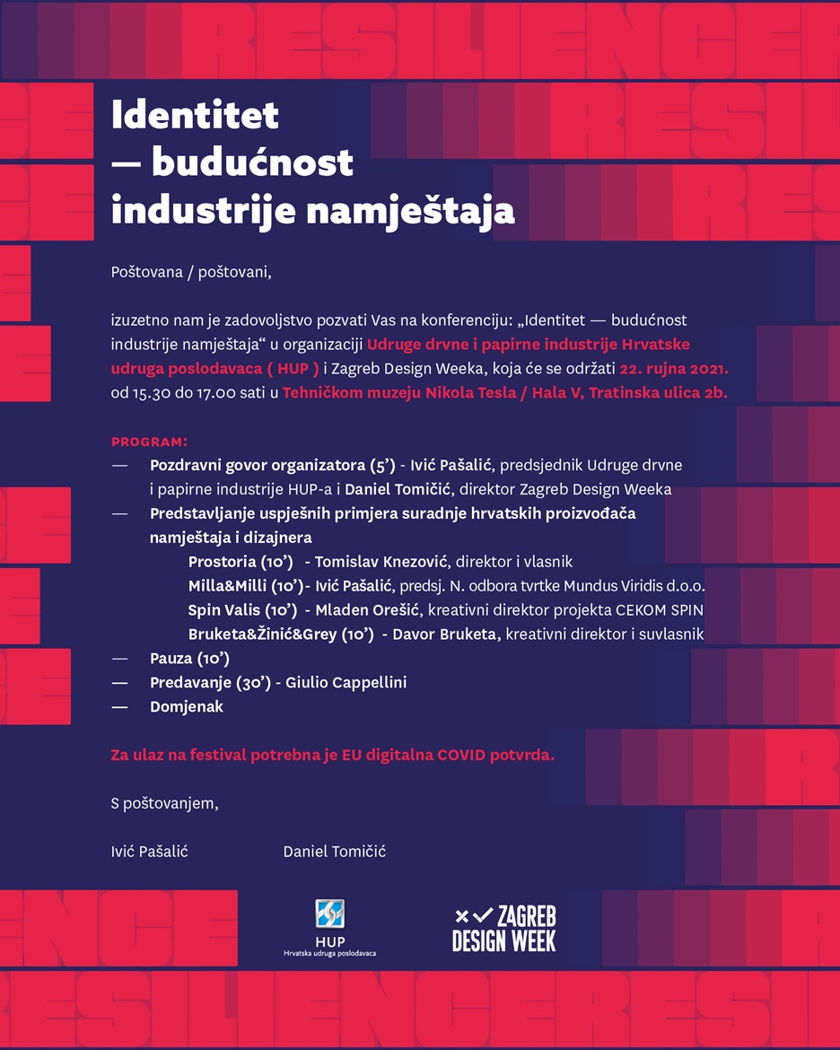 HUP- Udruga drvne i papirne industrije na čelu s predsjednikom Ivić Pašalić i u suradnji sa Zagreb Design Week organizira konferenciju 'Identitet - budućnost industrije namještaja' koja će biti održana 22. rujna 2021. godine od 15:30 do 17:00 sati u Tehničkom muzeju Nikola Tesla / Hala V u Zagrebu. Na konferenciji će uz ostale uzvanike posebno predavanje održati i renomirani dizajner Giulio Cappellini, umjetnički direktor talijanske dizajnerske tvrtke Cappellini sa sjedištem u Milanu 💡✨