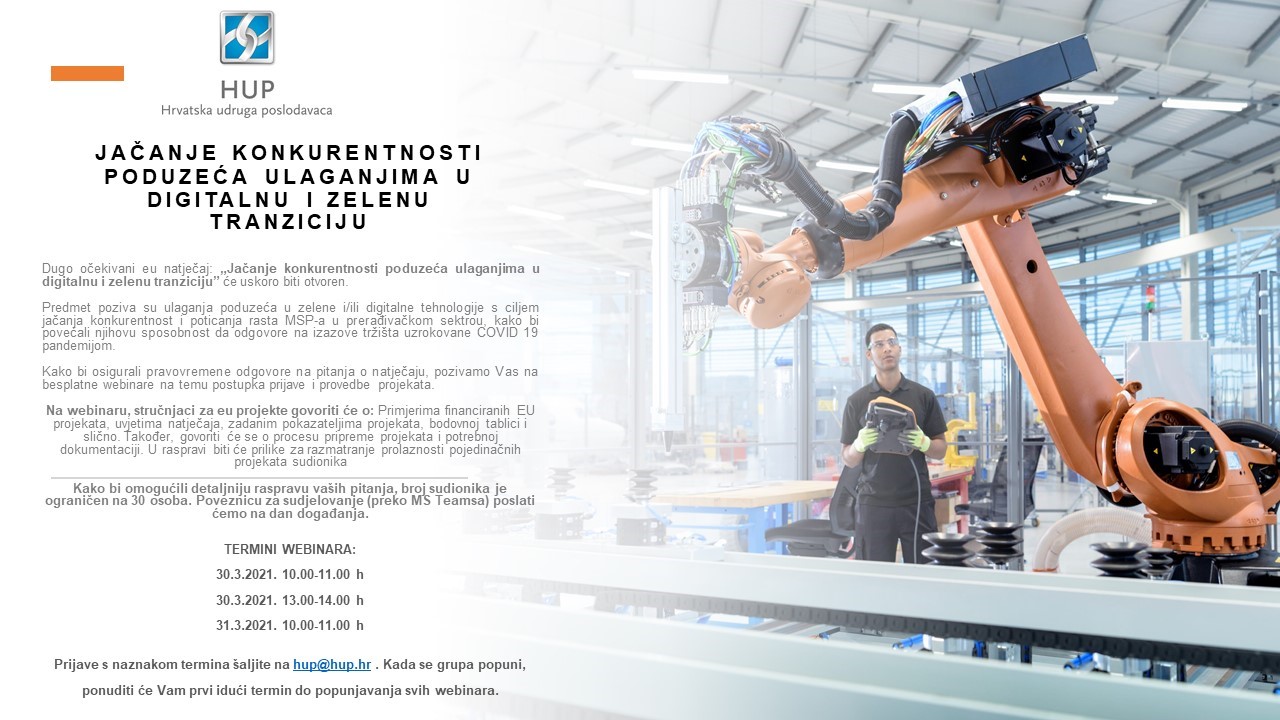 30. i 31.3.2021. Besplatni webinari o EU natječaju: Jačanje konkurentnosti poduzeća ulaganjima u digitalnu i zelenu tranziciju