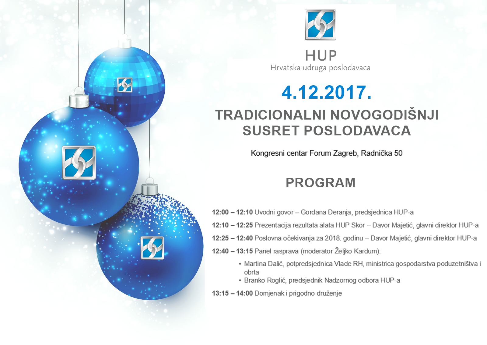 Pozivamo Vas da nam se pridružite 04. prosinca 2017., s početkom u 12:00 sati u Kongresnom centru Forum, Zagreb, Radnička cesta 50, gdje ćemo održati završno druženje poduzetnika na kojem ćemo objaviti rezultate istraživanja HUP Skor-a i rezultate ankete koju provodimo među poslodavcima o njihovim očekivanjima i planovima za sljedeću godinu. U drugom dijelu susreta organiziramo mini panel u trajanju 30-45 minuta na kojem će se razgovarati o rezultatima iz prethodnih prezentacija, ali i o planovima za sljedeću godinu uz sudjelovanje g. Branka Roglića, predsjednika Nadzornog odbora HUP-a i gđe. Martine Dalić, potpredsjednice Vlade RH, ministrice gospodarstva, poduzetništva i obrta. Prijavite svoj dolazak na hup@hup.hr zaključno s 1.12.2017. PROGRAM