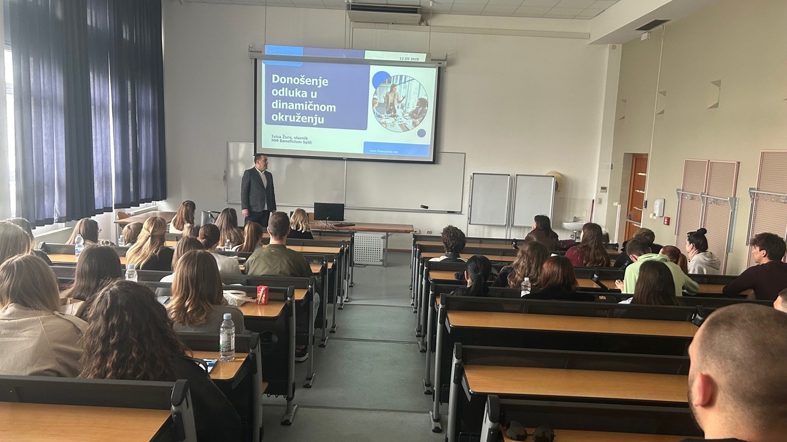 U srijedu, 12. ožujka 2025. godine, u sklopu kolegija Menadžersko odlučivanje na Ekonomskom fakultetu u Splitu, pod vodstvom prof. Ivane Bulog, održano je inspirativno predavanje poduzetnika Ivice Žure, člana HUP-a te osnivača i vlasnika tvrtke MM Beneficium Split. Predavanje je održano u sklopu ciklusa „Moja poduzetnička priča“ HUP-a Podružnice Dalmacija, a tema je bila „Donošenje odluka u dinamičnom okruženju“.