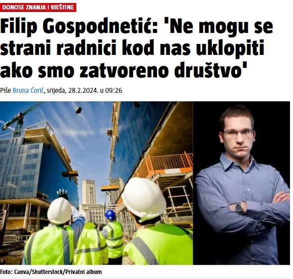- Budući da strani radnici nose sa sobom drugačije životno iskustvo, znanja, vještine i pogled na rješavanje problema, mogu biti važan kotačić u cijelom poslovnom procesu. Također, mogu pomoći hrvatskim zaposlenicima da obogate i prošire svoj uobičajen način razmišljanja o raznim životnim, ali i poslovnim temama - zaključuje socijalni psiholog i poduzetnik Filip Gospodnetić.