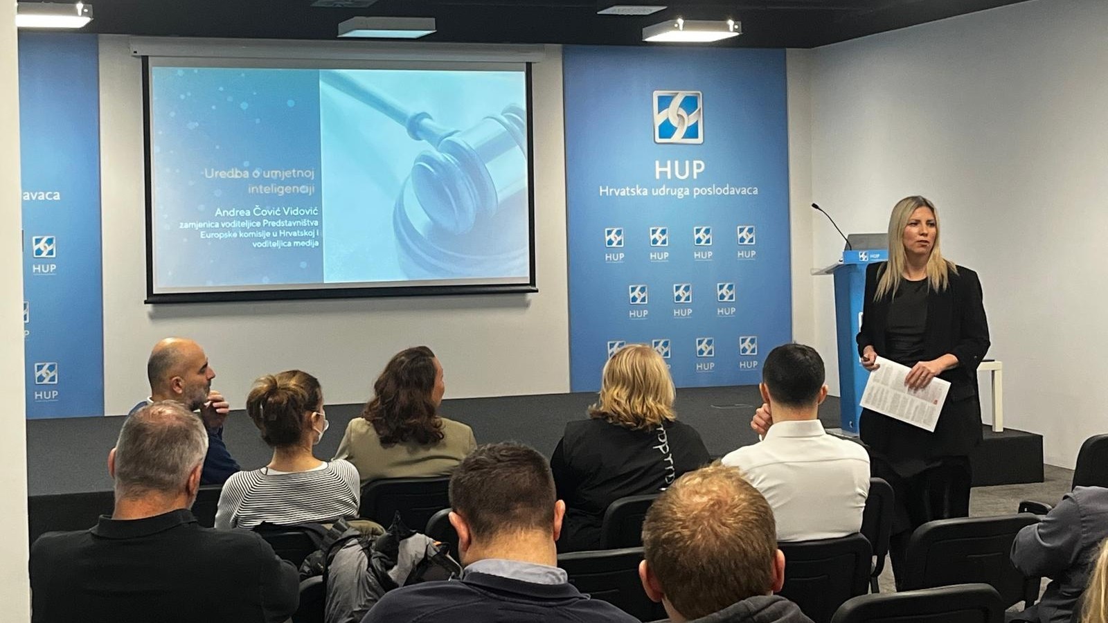 U prvome dijelu radionice glavnu je riječ imala gostujuća predavačica radionice bila je Andrea Čović Vidović, zamjenica voditeljice Predstavništva Europske komisije u Hrvatskoj i voditeljica medijskog tima, koja je sudionicima predstavila ključne elemente Akta o umjetnoj inteligenciji. U svom izlaganju naglasila je regulatorni okvir Europske unije, pristup temeljen na procjeni rizika te važnost pravne sigurnosti za poduzeća u procesu razvoja i primjene AI rješenja.