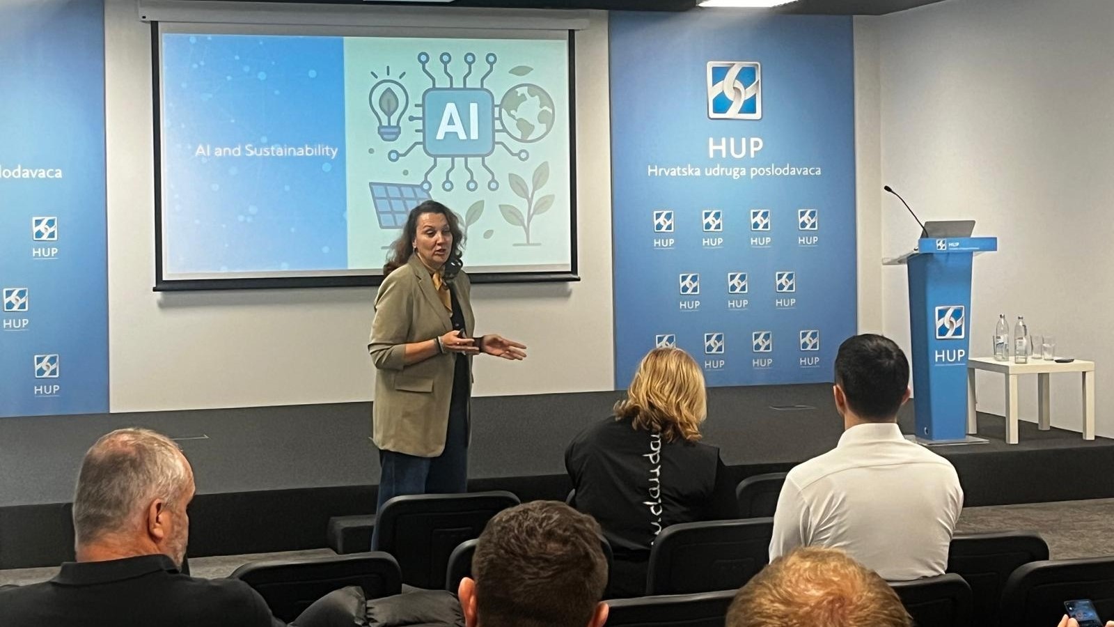 Drugi dio radionice, posvećen primjeni umjetne inteligencije u poslovnim procesima, vodio je Bojan Hadžisejdić, redovni predavač ciklusa i član Izvršnog odbora HUP-ICT-a, koji je istaknuo kako umjetna inteligencija više nije eksperimentalna tehnologija, već ključan alat za jačanje konkurentnosti i održivosti poslovanja. Poseban dio programa bio je posvećen razvoju AI strategije i organizacijskoj spremnosti. Završni dio prezentacije predavač je prepustio Petri Čiček iz Microsofta koja je govorila o korelaciji umjetne inteligencije i održivosti.