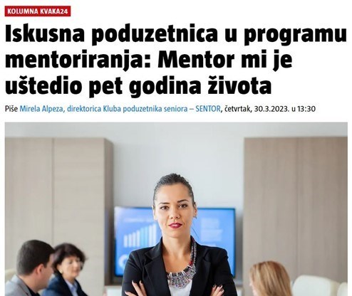 Zahvaljujući partnerstvu s Hrvatskom udrugom poslodavaca, SENTOR je u proteklih godinu dana imao prilike raditi na razvoju i prilagodbi metodologije mentorstva, koja je u značajnoj mjeri preuzeta od partnerskog udruženja SOUNDBOARD iz Nizozemske. Ovo udruženje djeluje više od 40 godina, okuplja 300 mentora i godišnje pruža podršku za više od 2000 nizozemskih poduzetnika. Cijelu kolumnu pročitajte na poveznici: https://www.24sata.hr/kvaka24/iskusna-poduzetnica-u-programu-mentoriranja-mentor-mi-je-ustedio-pet-godina-zivota-900963