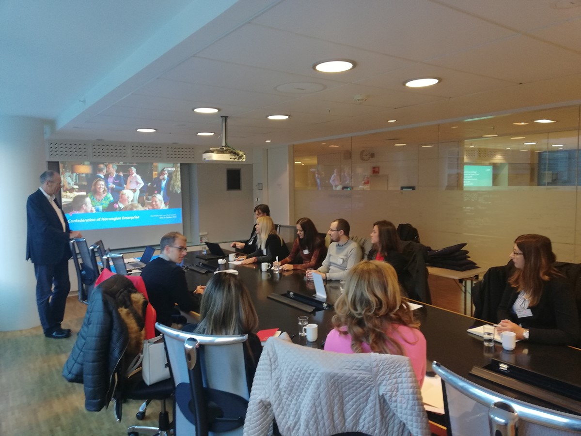 Tijekom posjeta, u sjedištu NHO-a održano je nekoliko sastanaka na kojima su članovi delegacije imali prilike saznati nešto više o organizaciji NHO, njihovim aktivnostima, lobiranju, odnosima sa državnim tijelima i sindikatima te socijalnom dijalogu sa stajališta NHO i sindikata LO. Tako je pravni savjetnik NHO, Henrik Munthe održao 2 prezentacije, jednu u kojoj je detaljnije predstavio NHO i drugu u kojoj je govorio o socijalnom dijalogu u Norveškoj sa stajališta poslodavaca. Stein Regård, glavni ekonomist Norveške konfederacije sindikata -The Norwegian Confederation of Trade Unions, LO, govorio je o socijalnom dijalogu sa aspekta sindikata. Bilo je zanimljivo čuti o razlikama skandinavskog modela sindikalnog organiziranja i sindikata drugih europskih zemalja, primjerice Francuske i Njemačke. U skandinavskim zemljama, a poglavito Norveškoj, sindikalna zastupljenost je puno veća. LO je najveća i najutjecajnija radnička udruga u Norveškoj. Ima tradiciju djelovanja koja traje više od 100 godina. Preko 900 000 radnika je organizirano u 26 sindikata koji su udruženi u LO. U LO djeluju sindikati javnog i privatnog sektora. Gjermund Løyning, voditelj Odjela komunikacija NHO, prezentirao je lobističke aktivnosti NHO i načine na koji se lobira u Norveškoj. Partneri iz Hrvatske su postavljali pitanja o problemima koja muče Hrvatsku vezana za zapošljavanje, konkurentnost i održivi gospodarski razvoj.