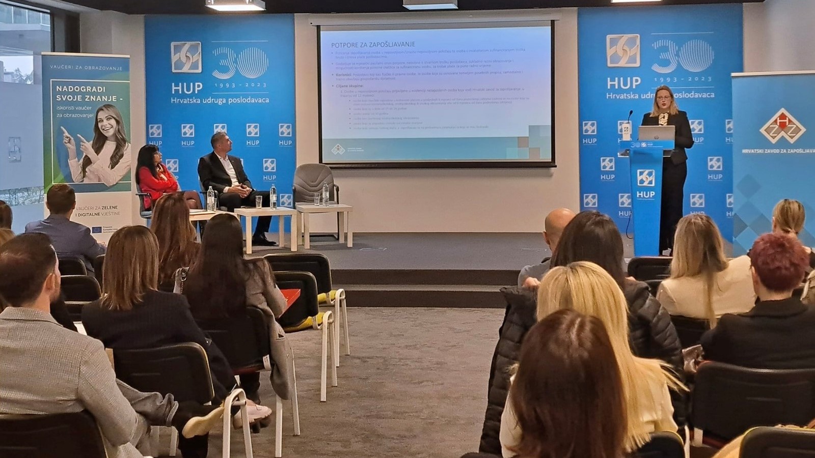g. Tomislav Bitunjac, pravni savjetnik u Hrvatskoj udruzi poslodavaca, održao je uvodni govor i zahvalio se poslodavcima na iskazanom interesu i odazivu u velikom broju. Navedene mjere prezentirali su predstavnici HZZ-a: gđa Marina Matijašec Rasinec – Rukovoditeljica Odjela za mjere aktivne politike zapošljavanja (HZZ) te gđa Ksenija Vragović – Rukovoditeljica Odjela za rad s poslodavcima (HZZ) te g. Dražan Dodig, v.d. predstojnik Područne službe Zagreb (HZZ). Tijekom prezentacije prisutni članovi HUP-a postavljali su pitanja predavačima i dobili sve potrebne odgovore i pojašnjenja o mjerama HZZ-a kao i kontakt podatke za bilo kakve daljnje upite. Ova radionica informirala je poslodavce o mogućnostima korištenja mjera koje nude financijsku potporu za zapošljavanje, kao i edukativne programe za usavršavanje, pokriće dijela troška plaće i zapošljavanje u specijaliziranim sektorima. Kao što vam je poznato, HZZ svake godine donosi mjere aktivne politike zapošljavanja kao instrument za uključivanje na tržište rada onih skupina nezaposlenih osoba koje su zbog niza razloga u nepovoljnom položaju na tržištu rada. Vlada RH je 28. prosinca 2023.g. na svojoj 274. sjednici prihvatila prijedlog zaključka o podržavanju donošenja Mjera aktivne politike zapošljavanja za 2024. godinu u nadležnosti Hrvatskog zavoda za zapošljavanje.