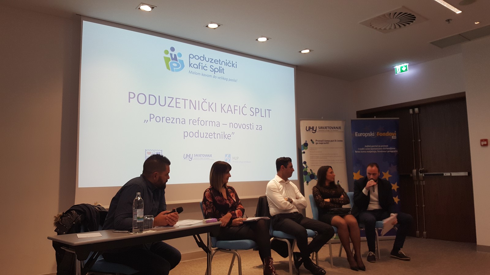 Grad Split , Hrvatska udruga poslodavaca i UHY Savjetovanje d.o.o. organizirali su 29. studenog 2018. godine u Hotelu Radisson Blu Resort Split trinaesti Poduzetnički kafić na temu „Porezna reforma - novosti za poduzetnike“. U neformalnom druženju uz kavu, gosti predavači su govorili o tome što uistinu donosi nova porezna reforma, a prisutni su imali prilike uključiti se komentarom ili pitanjem. U panelu su sudjelovali predstavnici tvrtki iz HUP-a, Helena Budiša, dopredsjednica Izvršnog odbora HUP-a Podružnice Dalmacija i vlasnica tvrtke UHY HB Ekonom, Viktor Nemorsanski, financijski direktor Hotela Radisson Blu Resort & Spa Split te Marija Stupalo, direktorica trgovačkog društva SALONA VAR d.o.o. Da ne bi sve bilo sa poduzetničkog aspekta, pobrinuo se panelist Paško Burnać, docent Sveučilišta u Splitu, Ekonomski fakultet Split.