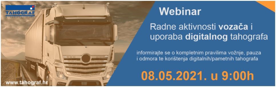 Respektabilni član HUP-Udruge prometa, Tahograf d.o.o. 8.5.2021. godine s početkom u 9h održat će webinar na temu: • kompletnih pravila vožnje, rada, odmora i pauza • pravilne upotrebe digitalnog tahografa • razlikame između digitalnih i pametnih tahografa • naknadnom unosu aktivnosti na vozačkoj kartici te • što nas sve čeka u budućnosti u svijetu tahografa